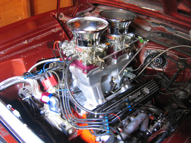 The boat anchor 318 is gone and now features an eye popping big-block Chrysler 400 H.P. Wedge headed monster.